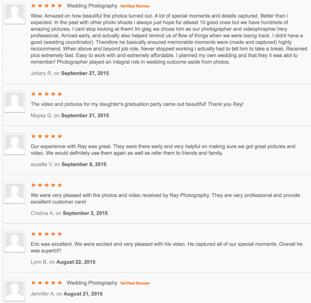 Ray Photography and Video has been in business for the past 17 years and define our success by achieving the highest level of customer satisfaction possible.